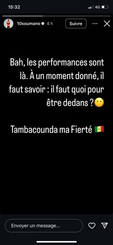 Sur son compte Instagram, Sambou Soumano n’a pas caché sa déception. L’attaquant de Lorient, auteur de 10 buts depuis le début de la saison en Ligue 2 française, a été emporté par sa frustration. « Bah les performances sont là. A un moment donné, il faut savoir : il faut quoi pour être dedans ? », a écrit Soumano qui a clamé sa fierté pour Tambacounda. Comme pour faire savoir qu’il est Sénégalais de naissance, un pur « Tambacoundois » qui mériterait plus que les joueurs nés et grandi en Europe encore appelé « binationaux ».