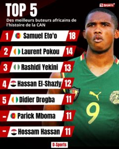 Parmi les meilleurs buteurs de l’histoire de la compétition, l’homme aux 9 réalisations n’est plus qu’à deux unités de Didier Drogba (Côte d’Ivoire), Patrick Mboma (Cameroun) et Hossam Hassan (Egypte). Trois légendes qui comptent 11 réalisations chacune.